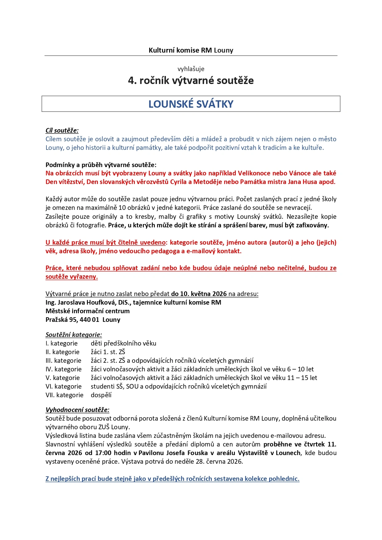 Louny - Kulturní komise Města Loun vyhlašuje výtvarnou soutěž s názvem Lounské svátky.