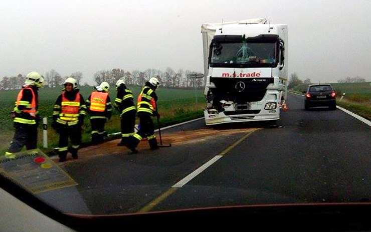 Hasiči zasahují u dopravní nehody kamionů. Foto: Oldřich Hájek