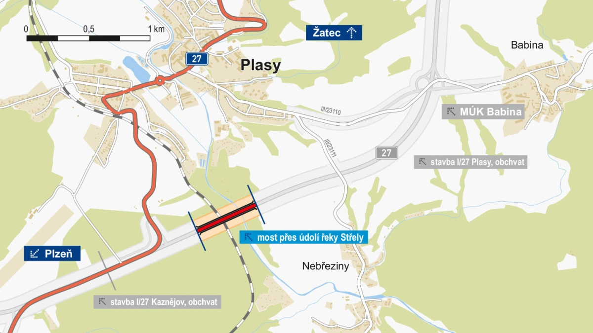Most přes řeku Střelu bude 496 metrů dlouhý, výška nad hladinou 87 metrů. Most bude součástí 5,6 km dlouhého obchvatu Plas na hlavním tahu z Plzně na Žatec. Protože se most bude nacházet v atraktivní lokalitě, počítá se na mostě také s chodníky a vyhlídkou na Plasy. Chodník bude tři metry široký a bude využit také jako cyklostezka. Od silnice bude oddělený svodidly. Vyhlídkové místo pak bude s průhlednou podlahou.