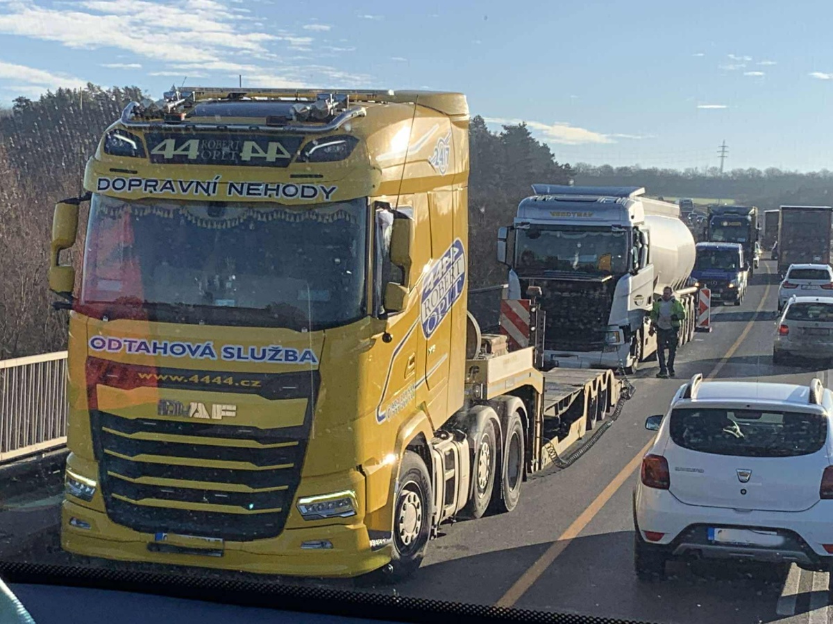 Podle aktuálních informací přímo od řidičů z místa zůstaly na vozovce stát dva nepojízdné kamiony. Tato překážka okamžitě způsobila dopravní špunt.