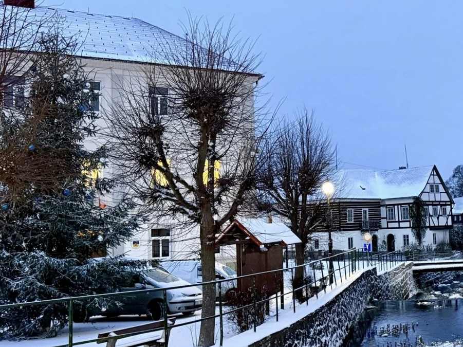 Budova úřadu, kde v pondělí došlo ke krveprolití. Vlevo je na snímku zachycen vánoční strom, který téhož dne nevydržel prudký nápor větru. Pro veřejnost jde o smutnou symboliku. Foto: FB Městečko Chřibská