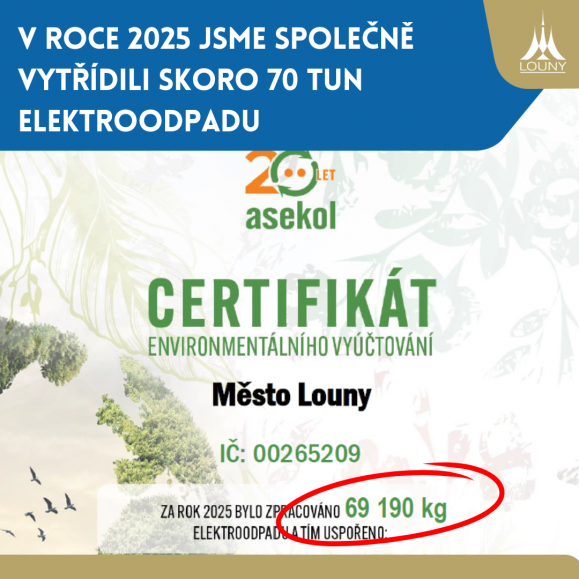 Přesně 69 190 kg vytříděného elektroodpadu v roce 2025. Z environmentálního vyúčtování společnosti ASEKOL vyplývá, že díky tomuto elektroodpadu se ve městě Louny podařilo ušetřit :