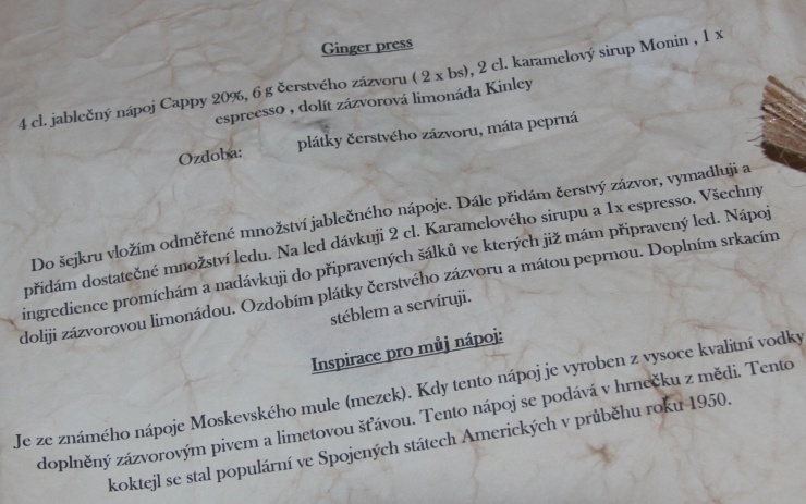 Své želízko v ohni na soutěži baristů měla také mostecké Soukromá hotelová škola Bukaschool. Naši redakci okouzlil jejich nápoj Ginger press a hlavně způsob, jakým nápoj porotě naservírovali. Nejen, že tento nápoj vypadal už sám o sobě velmi dobře, v pěkném šálku, ozdobený plátky zázvoru na napichovátku s lístky máty, ale ještě byl podán ve stylové a vyzdobené bedýnce, ve které nechyběl ani recept na přípravu tohoto oku lahodícího, nápaditého a osvěžujícího nápoje z kávy.