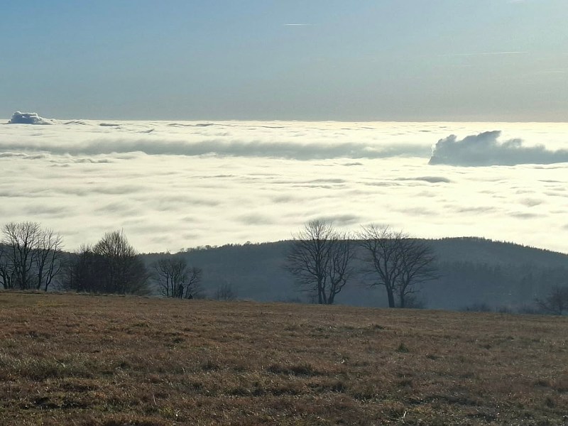 Krušné hory - Zatímco obyvatelé v údolí pod Krušnými horami včera prožívali šedivý a sychravý den, na hřebenech hor vládlo slunečné počasí a dechberoucí výhledy. Náš čtenář Jan Macháček nám zaslal fotografie z Dlouhé Louky u Oseka, která dokonale zachycuje fenomén teplotní inverze.
