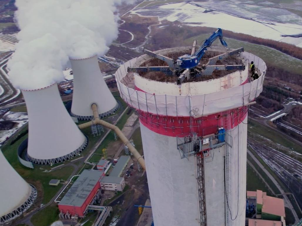 I když speciální bourací bagr byl do vnitřní koruny komína usazen zhruba v polovině roku 2025, vlastní demolice začala přípravami na ni a výběrem zhotovitele už o více jak rok dříve. „Jako první bylo nutné odstranit, ještě bez použití bagru, vnitřní cihlovou vyzdívku a celkově ho vyčistit od všeho, co by mohlo demolici zkomplikovat. Teprve pak se zakously jeho čelisti do okrajů vnějšího pláště. Kusy železobetonu jsou shazovány do vnitřních prostor komína, odkud jsou následně etapovitě vyváženy, vzorkovány a v případě kladných výsledků využity pro dorovnání plochy po Elektrárně Prunéřov 1.